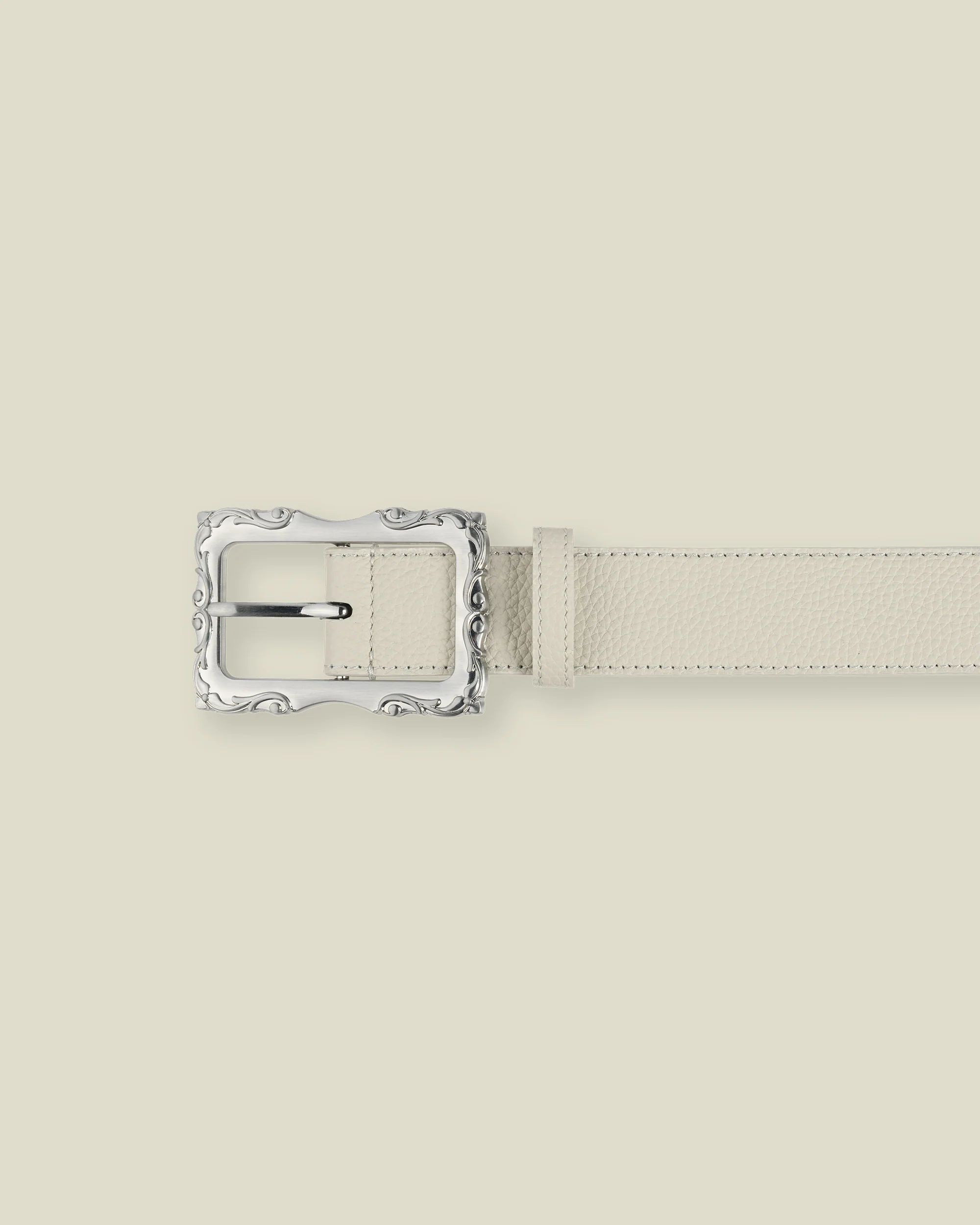 The Blanc Ornament Frame Belt is crafted from 100% genuine leather. The silver buckle is crafted out of detailed ornaments and is inspired by the Systemic bronze building sign. This belt features a soft pebble leather in Blanc, the standout design is completed with a striking metal star tip, making it the perfect accessory to elevate your look.