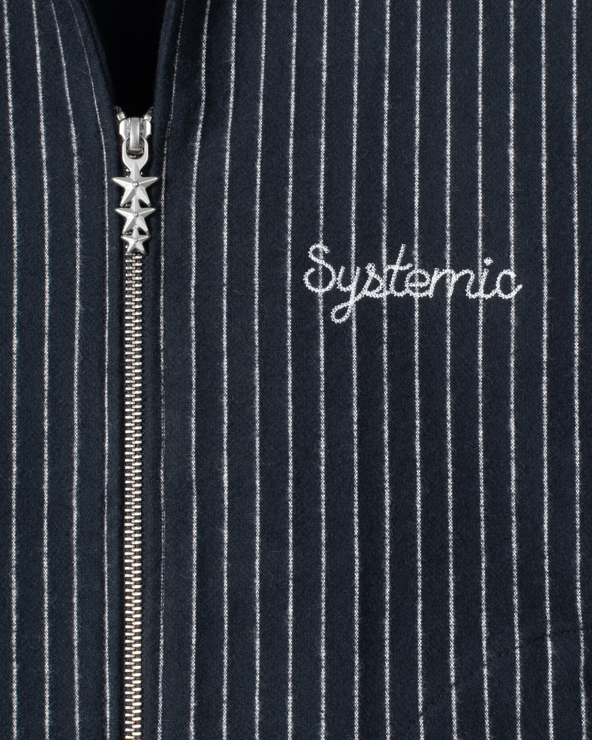 The Indigo Pinstripe Jacket is crafted out of 100% premium cotton for a soft yet structured feel. This jacket features Systemic’s signature star zipper, a unique detail that adds a touch of modern elegance. The classic pinstripe optic in navy with chalk white stripes delivers a refined look, perfect for versatile styling.