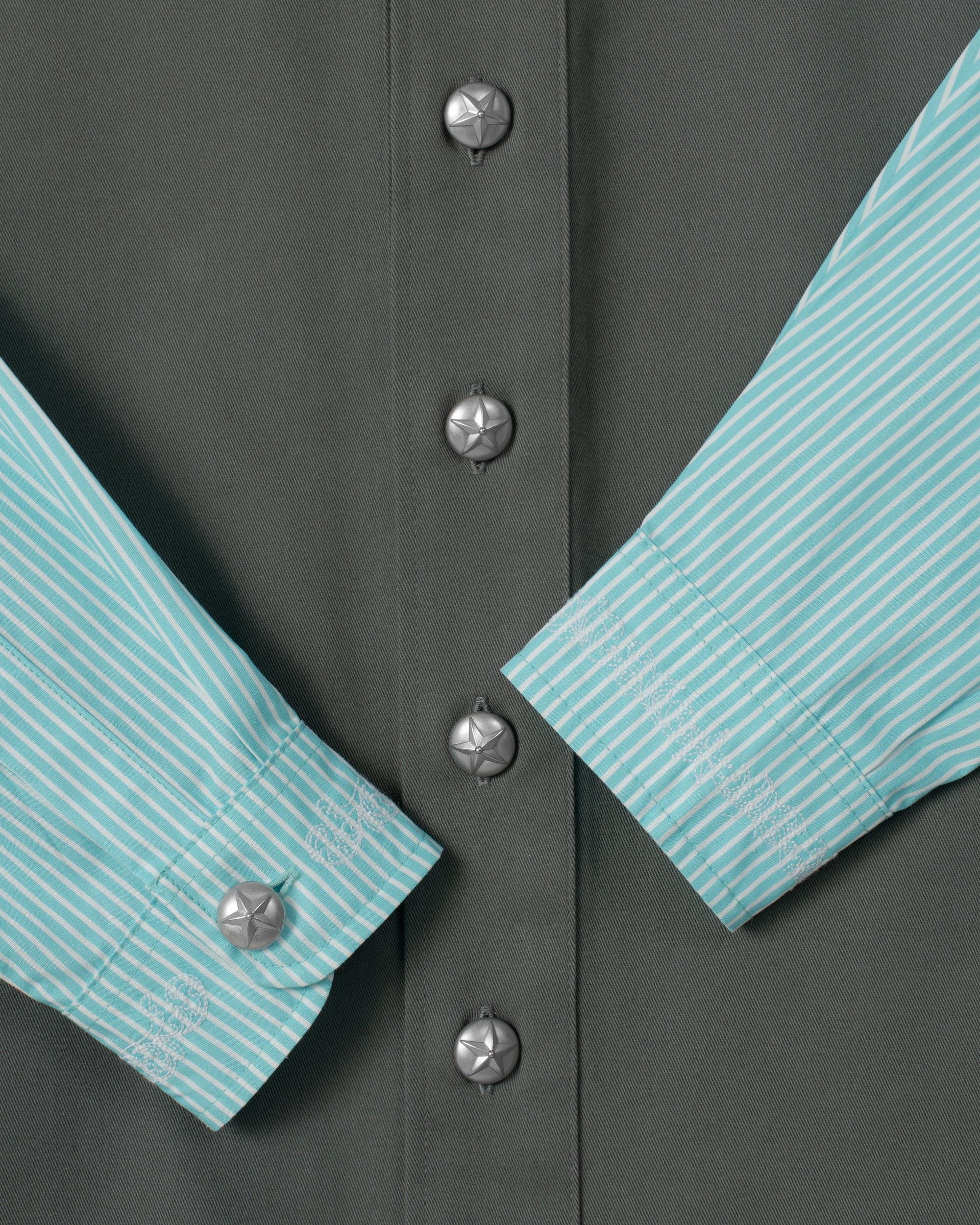 The Office Vest Shirt consists of two parts merging elegance and casualty. The middle part is a soft, grey cotton vest while the sleeves and the collar are made out of blue/white striped shirt fabric. The cuffs on the sleeves have embroidered Systemic Ornaments and Systemic Star Buttons. The front is refined with signature Systemic Star Buttons.