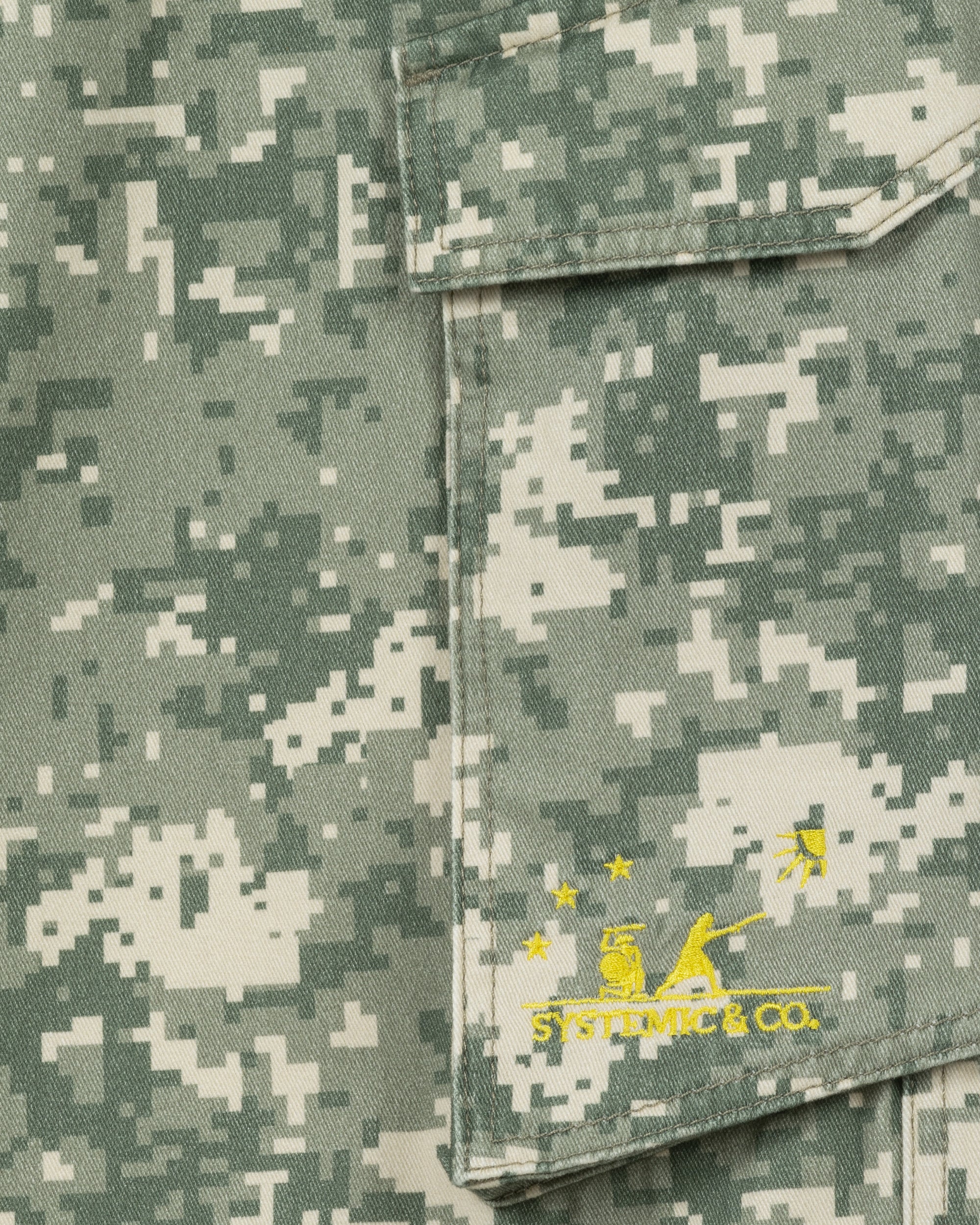 Our Olive Digital Defender Cargo is characterized by our special washing treatment and aging process. It features an elastic waistband with drawstrings and eight pockets together with a small, yellow hyper-definition embroidery on the pocket. The leg opening is adjustable with added drawstrings to optimize the perfect width when wearing.