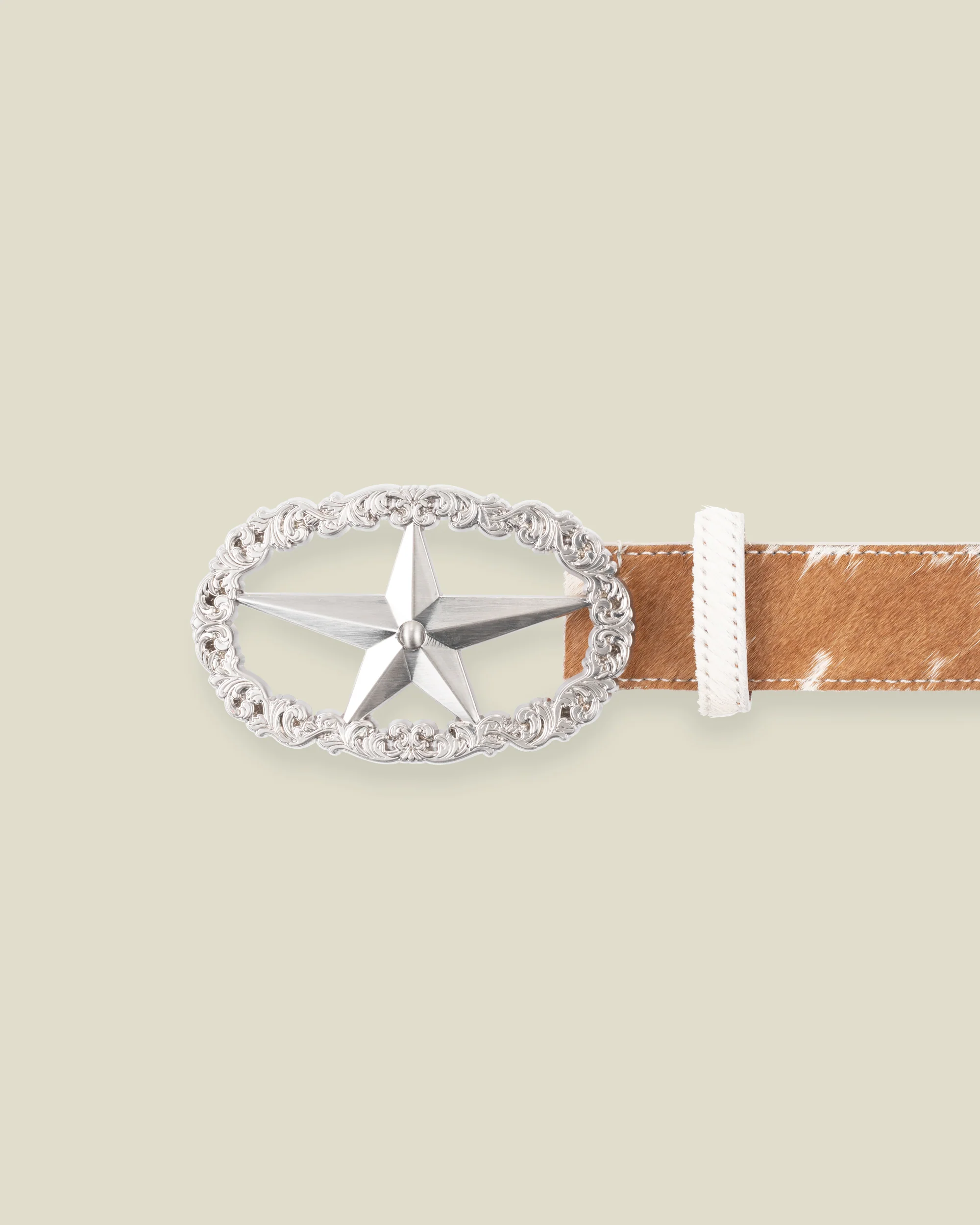 The Ornament Star Belt is crafted from 100% genuine leather. The silver Buckle is oval shaped and consists of highly detailed Systemic Ornaments and a big Systemic Star in the middle. This belt features a unique cow hair pattern that adds a touch of luxury to any outfit. The standout design is completed with a striking metal star tip, making it the perfect accessory to elevate your look.