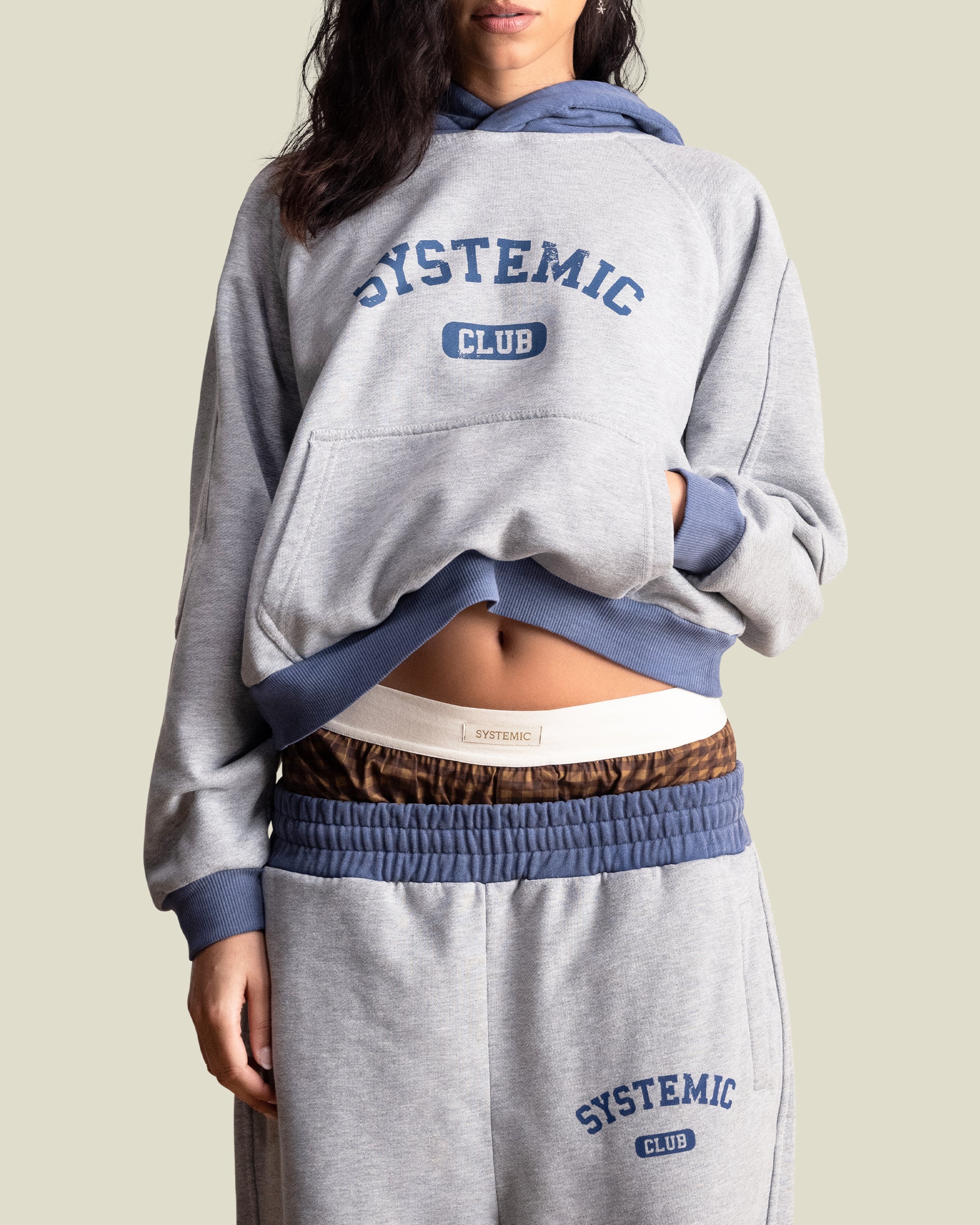 The Two Tone Systemic Hoodie features a navy rib with a perfect heavy wash and slight peeling to add an authentic vintage feel to the fabric and print on the chest. It also features a raglan cut and Systemic signature seams around the arms and back. All of our Hoodies went through an aging treatment to keep the product unique and special.