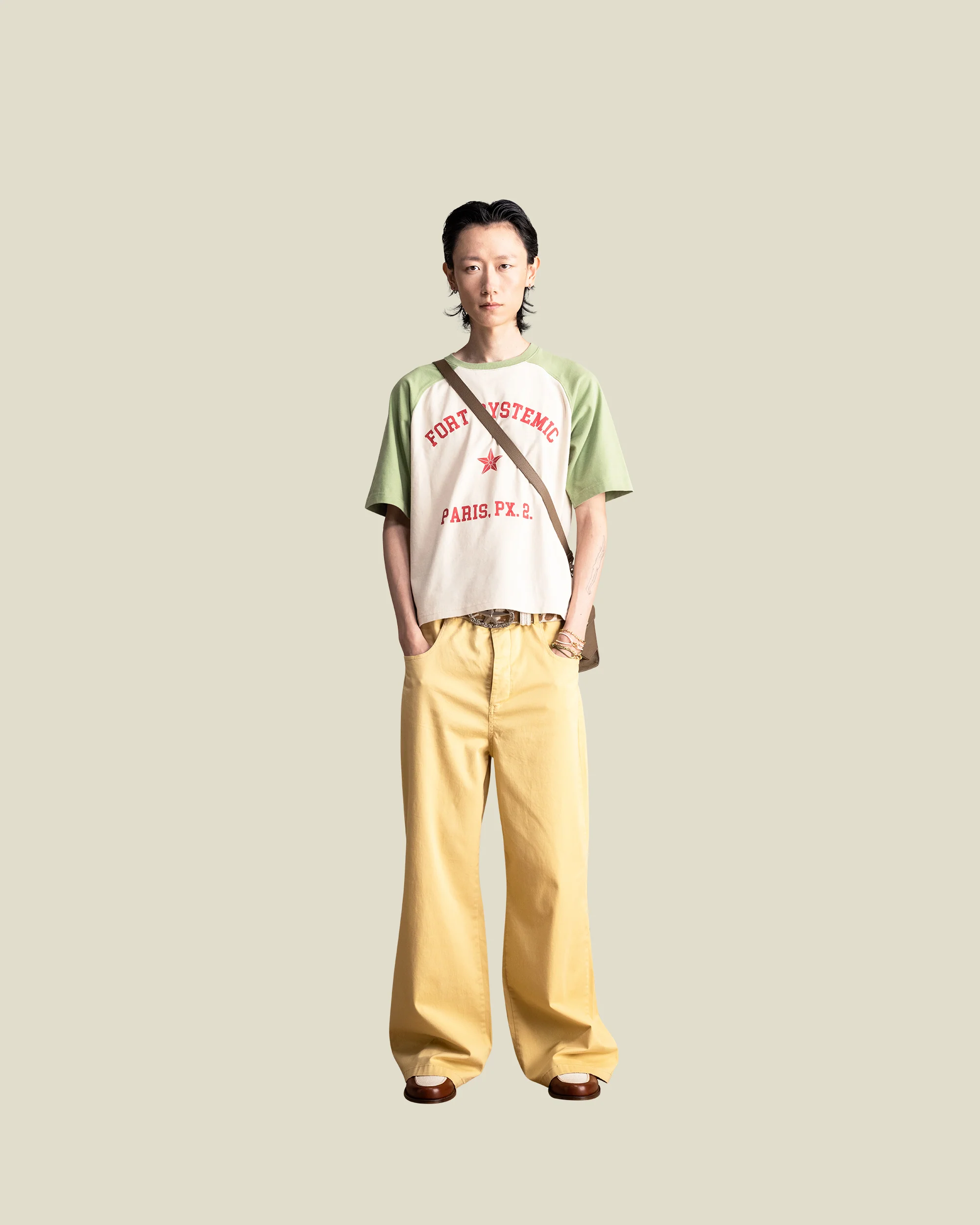 Our Vintage Paris T-Shirt features signature Systemic rounded raglan seams dividing the bright green from the cracked vintage white base color. It also features a bright red colored print on the chest. Every T-Shirt has a unique wash optic and has been through a special aging treatment for the perfect vintage feel and cracked white look.